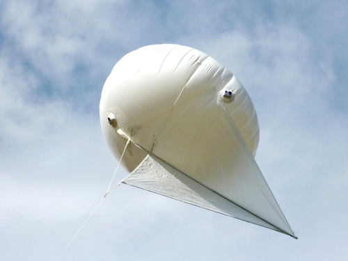 Flies in winds up to 35mph. Size: H: 5ft 5in W: 7ft L: 9ft. It fits fully inflated in a large van or trailer. This Helikite can be modified to carry multiple cameras of the customer's choice. The price includes customised Velcro fittings for the cameras.